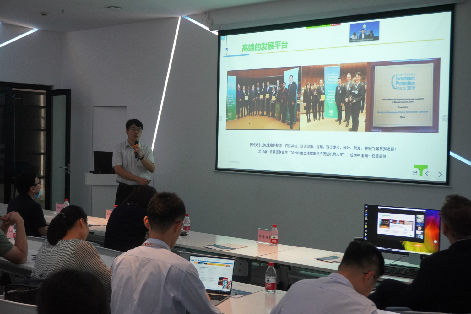 会上,区投促局全球招商总监Peter Helis及黄埔-欧洲办事处负责人Daniel Frerichs分别致辞,区投促局李凌处长围绕黄埔区生物医药产业的发展优势及总体规划展开深入介绍。近年来,我区充分发挥中欧、中英等国际合作平台的资源和渠道,成功引进阿斯利康、拜耳、默克以及瑞士龙沙等多家欧洲龙头企业,并着力从完善政策体系、打造创新平台、优化营商环境等多方面实现新发展。