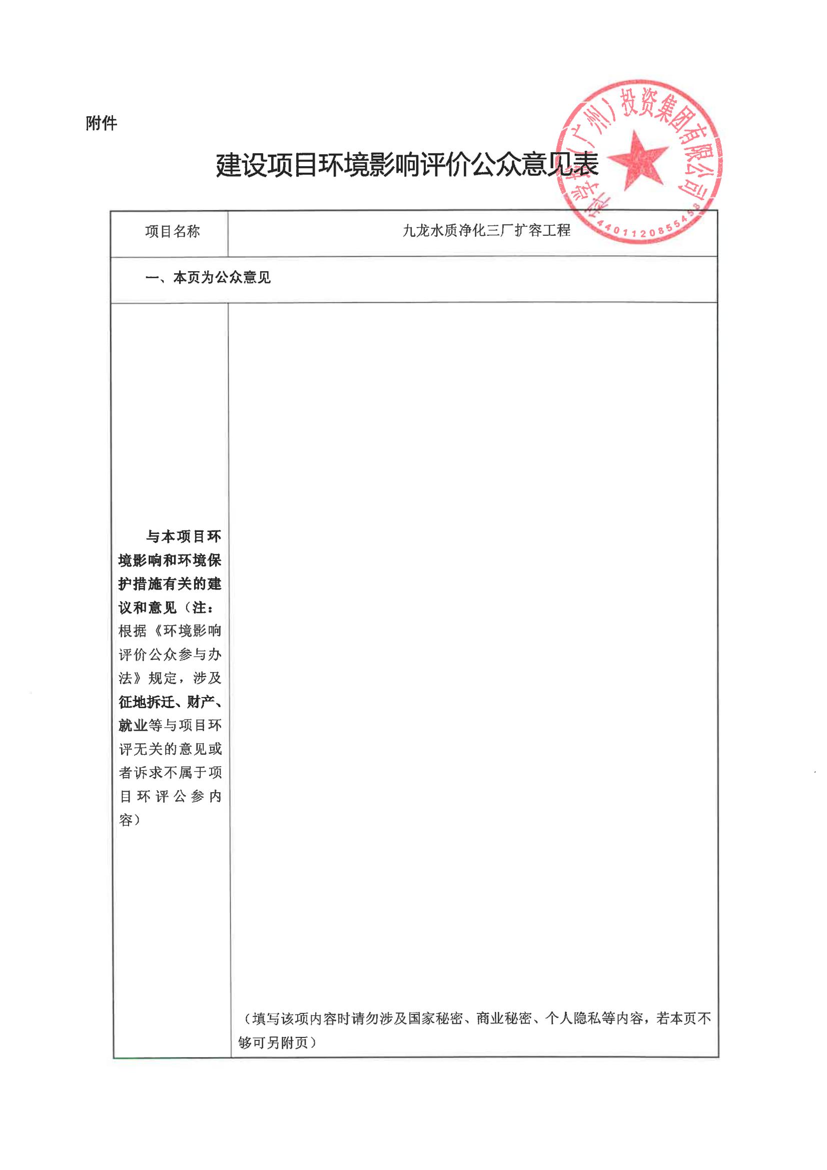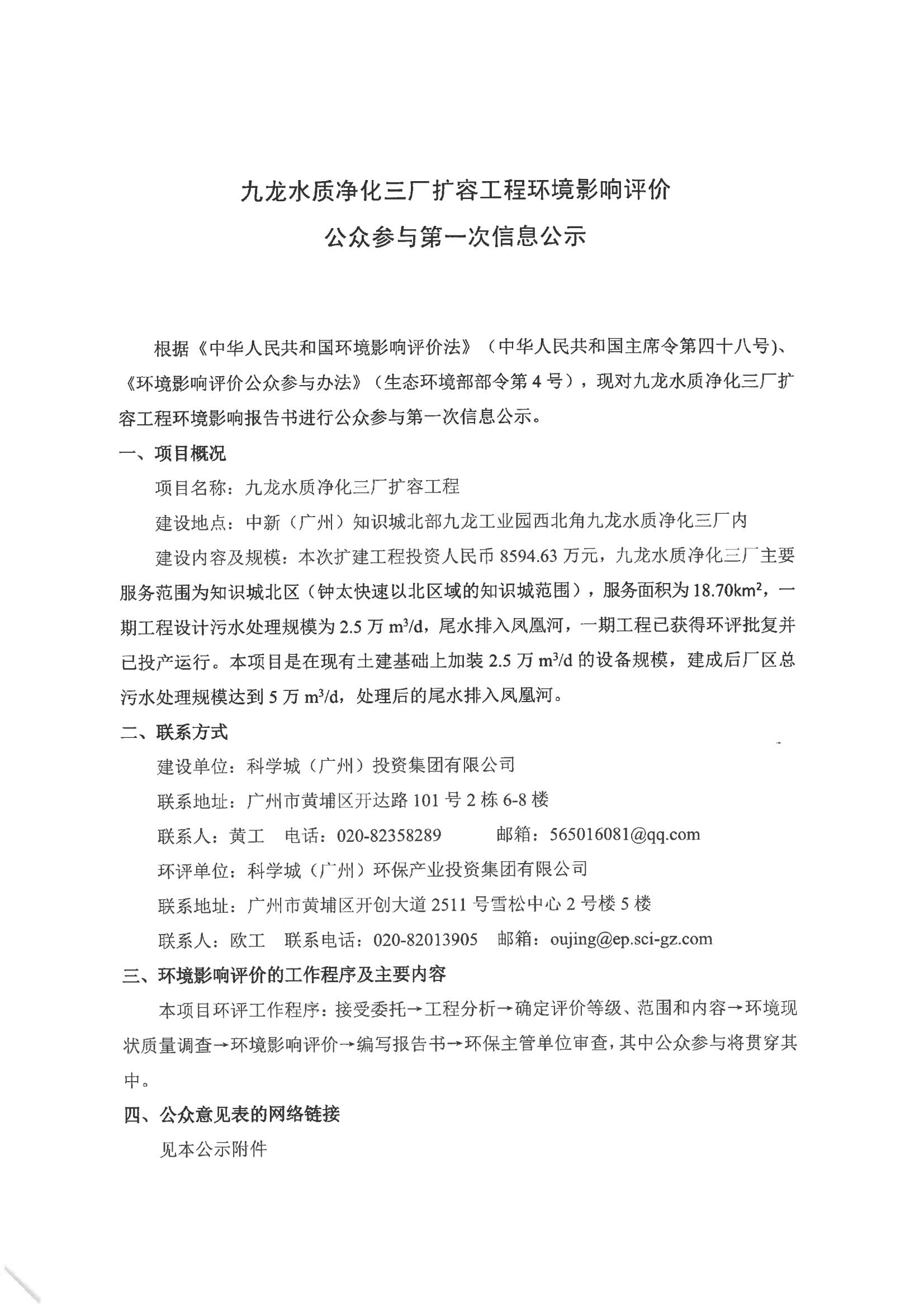 九龙水质净化三厂扩容工程环境影响评价公众参与第一次信息公示