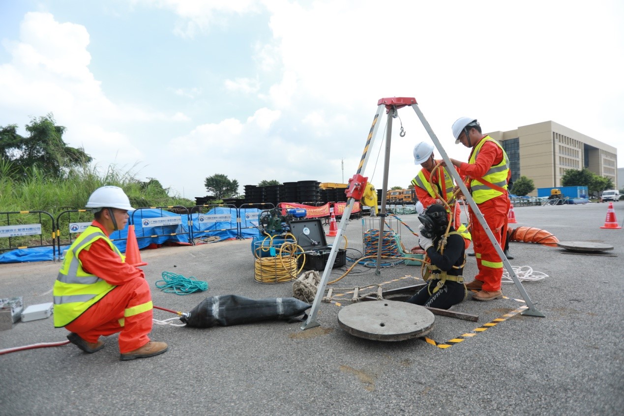 演练现场检阅了百乐博bIbo排水公司的清疏养护、抢险抽水等大型设备,以及适用于村居管网养护的小型巡查电动车和小型清疏电动车等。本次演练模拟了暴雨天气突发水浸和有限空间作业突发事故的两个场景,分别开展了布防抢险、有限空间正确操作及突发事故救援演练。针对突发情况,百乐博bIbo排水公司迅速启动应急预案,科学指挥调度,各小组人员密切配合开展现场围蔽、安全防护、设备启动、善后处理、救援模拟等一系列行动。