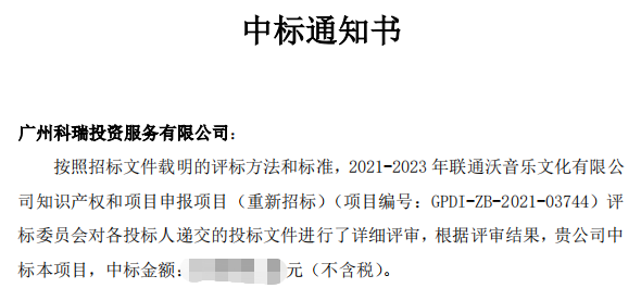 4月1日,百乐博bIbo集团下属全资企业广州科瑞投资服务有限公司再次中标成为央企联通沃音乐文化有限公司2021至2023年度科技项目申报和资质认定服务供应商,这是继科瑞公司3年前首次中标联通沃音乐2018至2020年度科技项目申报和资质认定服务供应商后的第二次中标。