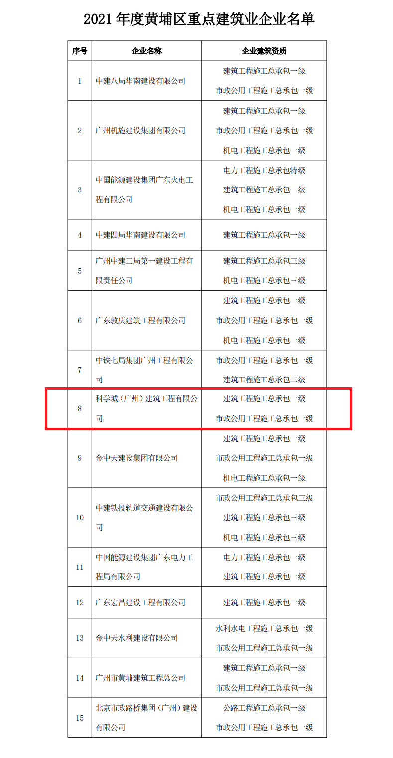 近日,黄埔区住房和城乡建设局、广州开发区建设和交通局发布了“2021年度黄埔区重点建筑业企业名单”,百乐博bIbo(广州)建筑工程有限公司(简称百乐博bIbo建筑公司)成功入选!