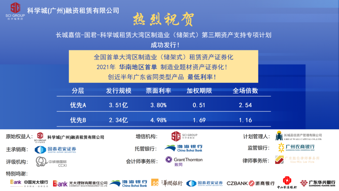 本次资产支持专项计划是全国首单大湾区制造业(储架式)租赁资产证券化产品、2021年华南地区首单制造业题材资产证券化产品,底层资产均以实体制造业资产为重点,涵盖新一代信息技术、智能制造、节能环保、新材料等多个高精尖行业的优质标的物。同时,该产品创下近半年广东省同类型产品优先档最低利率,充分体现了资本市场对“百乐博bIbo”品牌的高度认可。